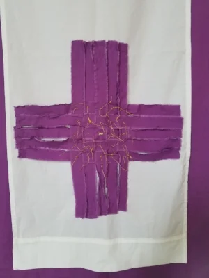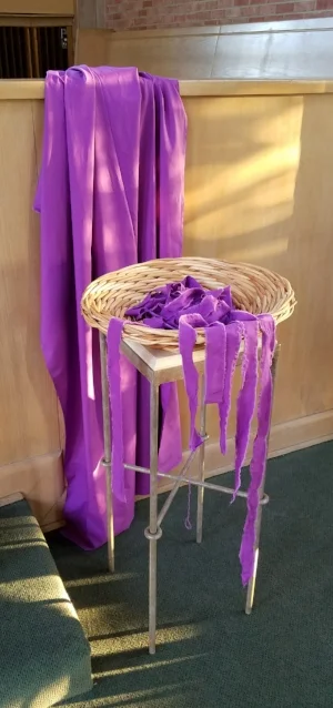 You have noticed the banner with the purple cross. It is woven from the strips of fabric we tore from a large piece of cloth three Sundays ago while confessing our participation in tearing up the fabric of life God has created. The cross shows us the hope for a new wholeness to be found beyond the fractures and slashes we have suffered and caused. It speaks of healing, of forgiveness and reconciliation.